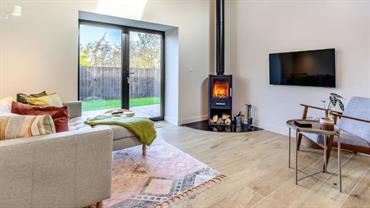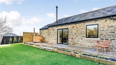 With woodburner, Smart TV, vaulted ceilings, Velux windows and patio doors leading to outdoor terrace and hot tub.