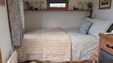 Sycamore Shepherd’s Hut is a beautifully crafted bespoke retreat, featuring a stylish oak interior and an exceptionally comfortable double bed, perfect for a peaceful countryside escape.