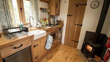 Inside the hut you’ll find a fully equipped kitchenette with a two-ring gas hob, microwave, small fridge, kettle, toaster and a charming Belfast sink. We’ve thought of everything: pots and pans, crockery, cutlery, cafetière, teapot, glasses, plus complimentary essentials including tea, coffee, hot chocolate, sugar, oil, salt, and pepper.