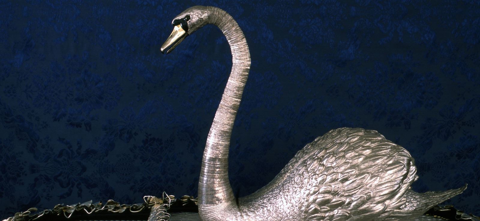 The Silver Swan is a solid silver replica of a female swan and one of the finest examples of 18th century automata in the world. An automaton is a clockwork designed to replicate real life. It was made in the workshop of James Cox in London and was first shown in his museum in 1773. It has three clockwork mechanisms and contains more than 2,000 moving parts, with several thousand in its whole.