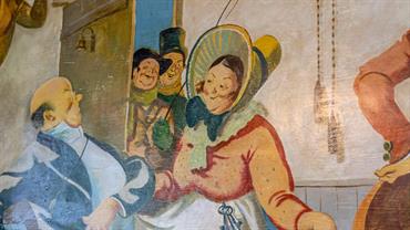 The bar has the only hand painted wall mural in the world painted in the 1940s by John Gilroy, the famous Northumbrian artist best known for Guinness advertising posters. The murals cover all four walls of the bar and depict a Dickensian scene of life in the 17th century with humour and history.