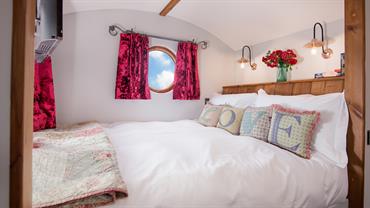 Through the sliding designer glass door, the en suite incorporates a luxurious spacious shower and towel warmer. At the opposite end of the hut sits the cosy elevated king-sized bed with eye level windows and HD TV which can be also be swung into the lounge area.
