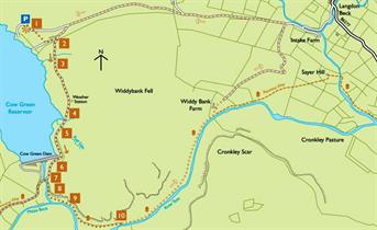 Park at Wheelhead Sike car park at Cow Green (NY 811 309) and follow the route on the map, stopping at the points marked. (N.B. These do not correspond to the nature trail markers).
